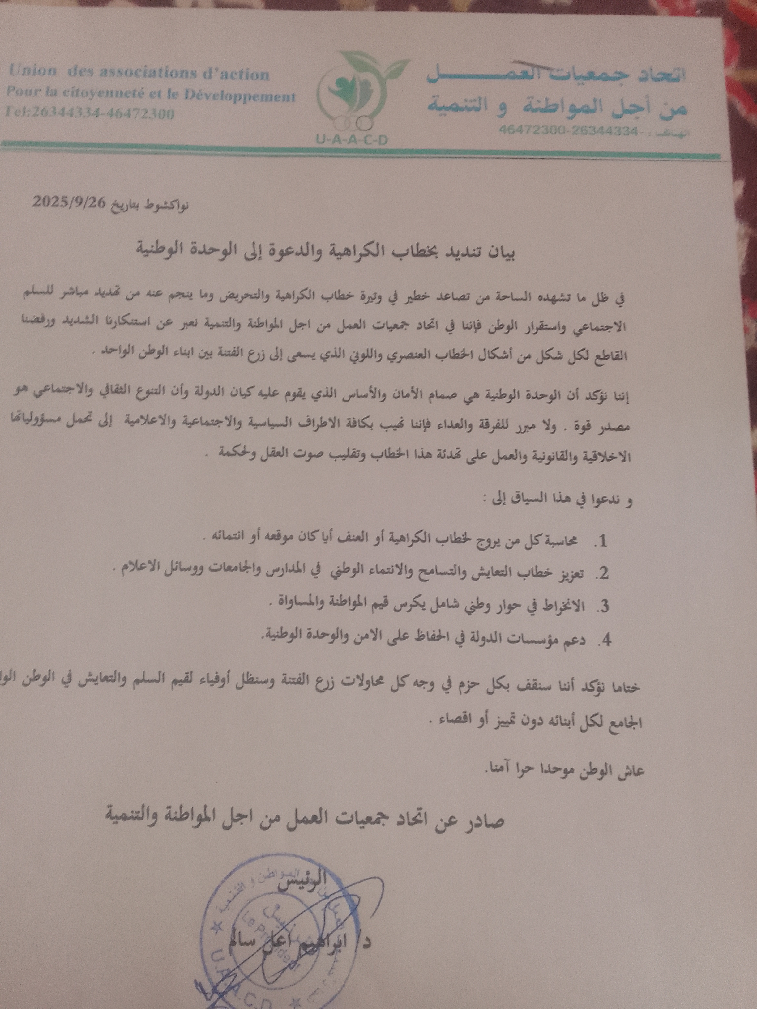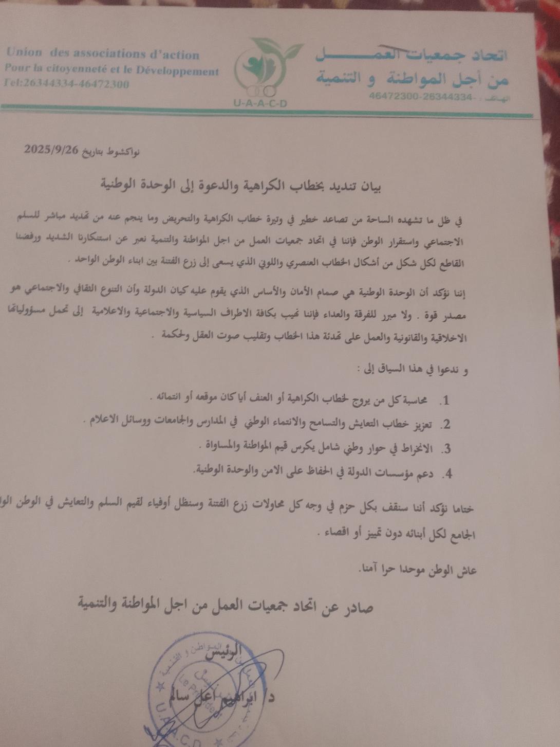 صادر عن: اتحاد جمعيات العمل من اجل المواطنة والتنمية نواكشوط بتاريخ 26\9\2025