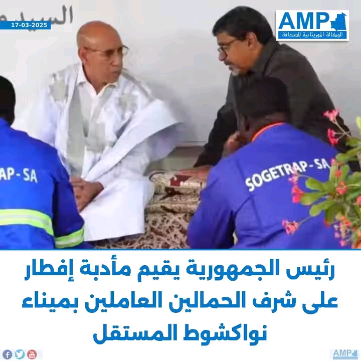 أقام رئيس الجمهورية محمد ولد الشيخ الغزواني، مساء اليوم الإثنين مأدبة إفطار في ميناء نواكشوط المستقل، على شرف الحمالين العاملين بالميناء.