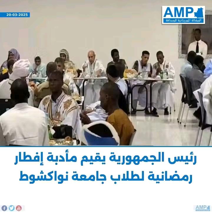 ترأس رئيس الجمهورية محمد ولد الشيخ الغزواني، مساء الخميس مأدبة إفطار رمضانية مع نخبة من طلاب الجامعة داخل الحرم الجامعي، بهدف الاستماع إلى تطلعاتهم ودعم مسارهم الأكاديمي.