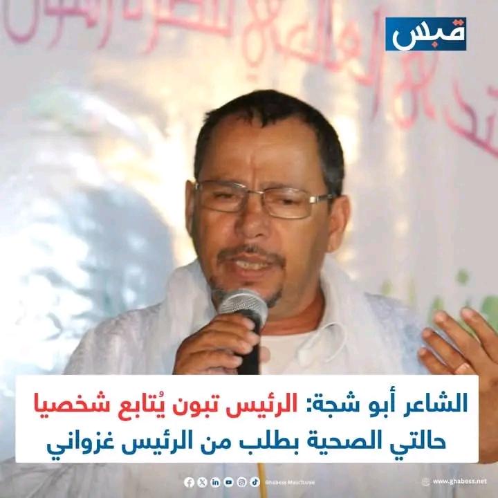 ويُوجد الشاعر أبو شجة، في رحلة علاجية لدولة الجزائر الشقيقة، بناءً على توصيات رئيس الجمهورية محمد ولد الشيخ الغزواني برموز الأدب والثقافة.